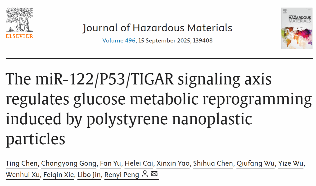 近日,开云电子(中国)官方网站_开云电子(中国)官方网站生命与环境科学学院彭仁义课题组在中科院一区期刊《Journal of Hazardous Materials》(IF=11.3)发表了题为“The miRNA-122/P53/TIGAR signaling axis regulates glucose metabolic reprogramming induced by polystyrene nanoplastic particles”最新研究。该研究聚焦聚苯乙烯纳米塑料(PS-NPs)污染这一全球性威胁,深入探究其通过靶向miRNA-122对糖代谢重编程的复杂影响机制。