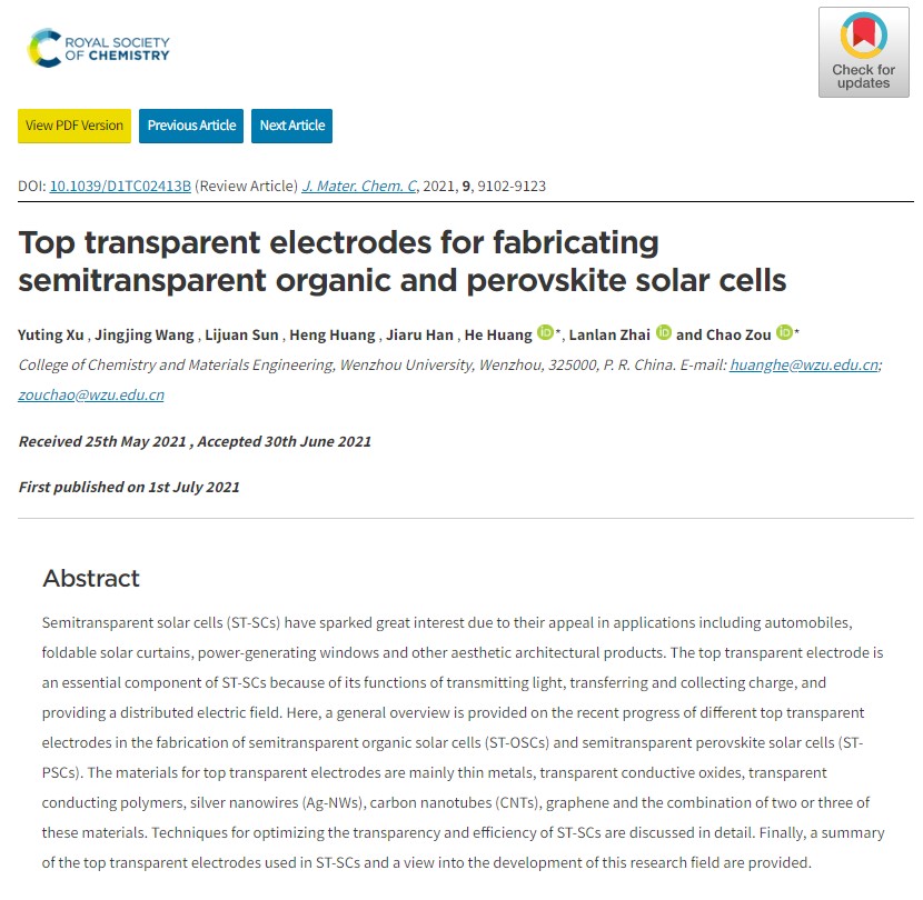 近日,我校2019级材料科学与工程专业硕士研究生许宇婷在权威期刊Journal of Materials Chemistry C上发表题为Top transparent electrodes for fabricating semitransparent organic and perovskite solar cells(顶部透明电极在制备半透明有机和半透明钙钛矿太阳能电池方面的应用)的综述论文,通讯作者为邹超教授和黄合博士。