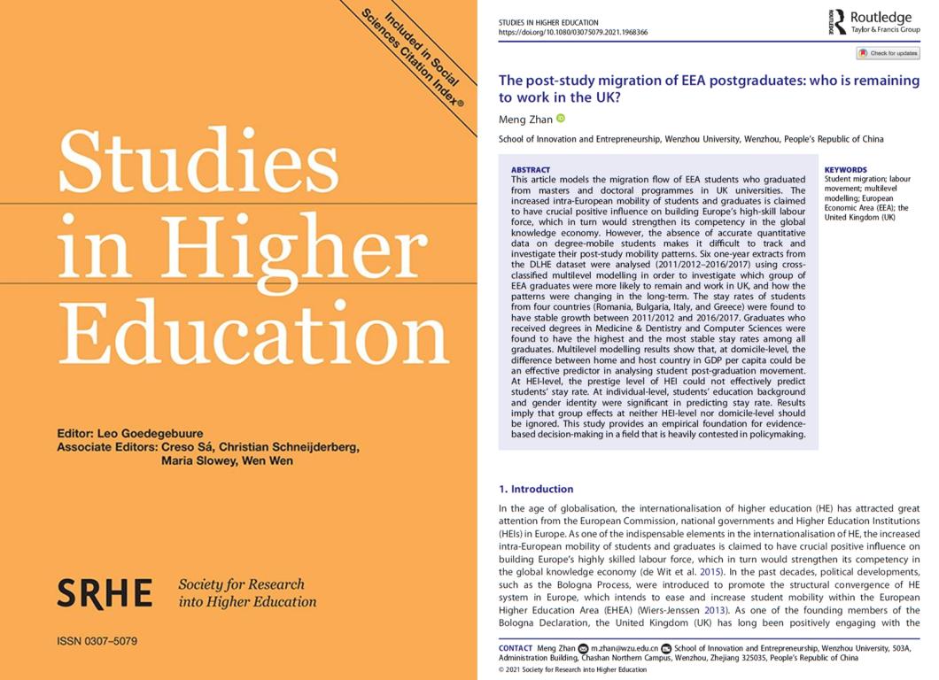 近日,教育学国际顶级期刊《Studies in Higher Education》接收了我校创新创业学院詹萌博士有关区域间高校毕业生流动的实证性论文“The post-study migration of EEA postgraduates: who is remaining to work in the UK? ”(欧洲经济区高校毕业生的跨国流动:关于留英工作群体的研究),詹萌博士为第一作者兼通讯作者,开云电子(中国)官方网站_开云电子(中国)官方网站为第一通讯单位。