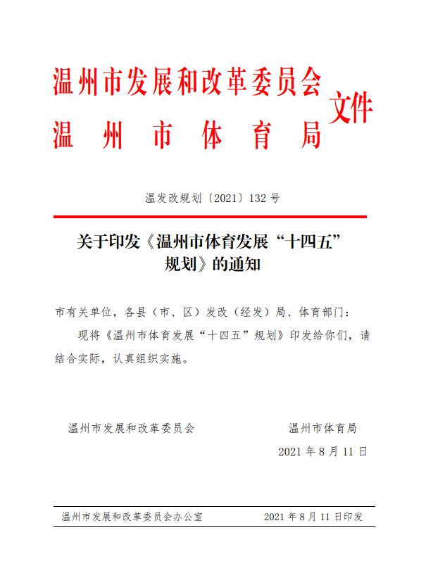 我校张文健教授主持起草的《温州市体育发展“十四五”规划》于2021年8月11日发布实施。开云电子(中国)官方网站_开云电子(中国)官方网站为项目委托起草单位,张文健教授为项目主持起草人。
