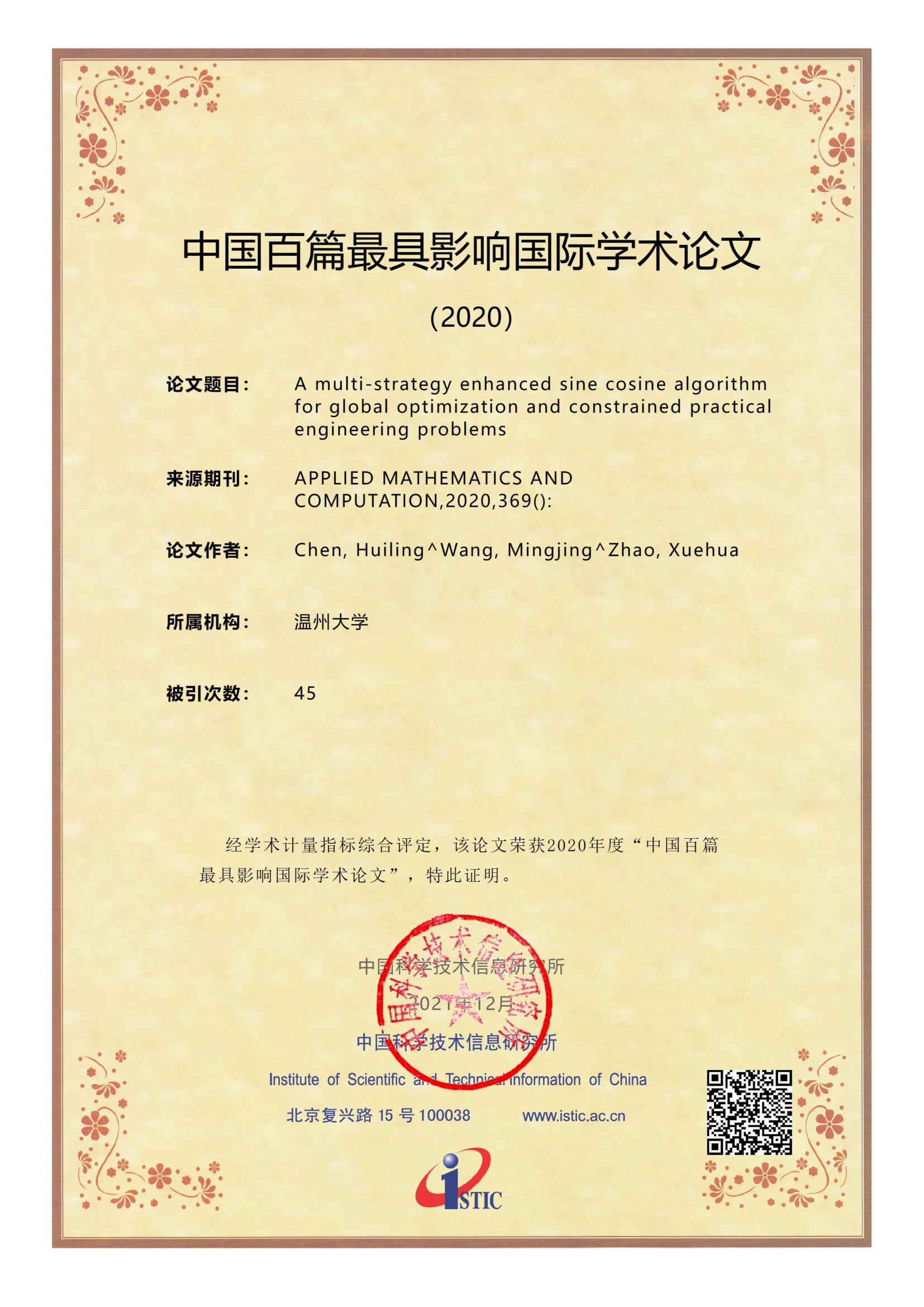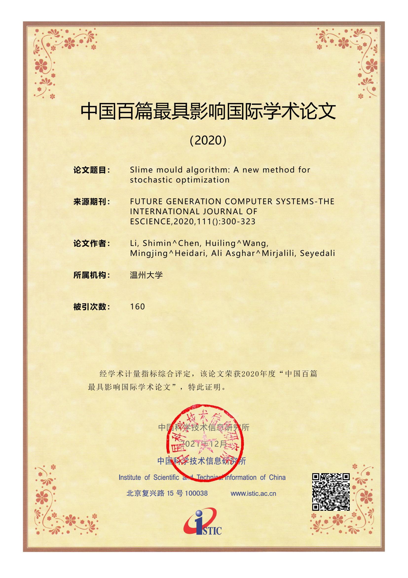 2021年12月27日,科技部直属的国家级公益类科技信息研究机构-中国科学技术信息研究所发布《2021年中国科技论文统计报告》,并评选出2020年“中国百篇最具影响国际学术论文”。开云电子(中国)官方网站_开云电子(中国)官方网站陈慧灵瓯江特聘教授团队2篇论文《A multi-strategy enhanced sine cosine algorithm for global optimization and constrained practical engineering problems》、《Slime mould algorithm: A new method for stochastic optimization》同时入选。