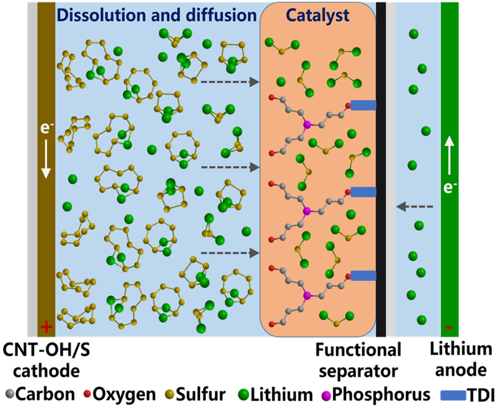 锂硫电池(LSBs)作为一种很有前途的新型电化学电源,具有理论能量密度高、成本低、环境友好等优点。然而,LSBs的商业化仍然受到多硫化物的穿梭效应和缓慢的反应动力学的阻碍,这会导致活性材料的不可逆损失、锂金属负极的腐蚀以及电池内阻的增加,最终导致电池短路,循环寿命和低库仑效率。幸运的是,有机分子改性碳基中间层的开创性研究工作,以缓解碳材料极性差的问题,增强物理和化学吸附,改善多硫化物催化转化的反应动力学而不影响其优势碳材料(快速传质和电荷转移等)。然而,有机分子通过简单的重组进入基体仍然会在有机电解质中损失。此外,催化转化的机制尚不清晰。因此,设计和开发与碳材料紧密结合的新型有机分子对于加速多硫化物的催化转化、抑制穿梭效应和保持其结构稳定性至关重要。