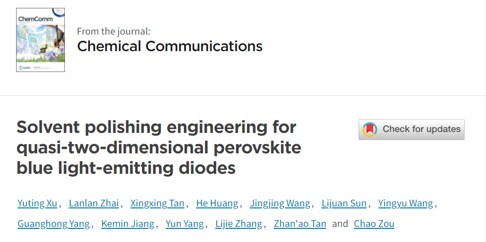 近日,我校化学与材料工程学院邹超教授课题组在蓝光LED领域的研究成果以“Solvent polishing engineering for quasi-two-dimensional perovskite blue light-emitting diodes”(https://doi.org/10.1039/D2CC02268K)为题刊发于化学领域著名刊物Chemical Communications。论文发表后,即入选“Chemical Communications期刊2022年热点论文”。Chemical Communications期刊由英国皇家化学学会主办,是自然指数源期刊。