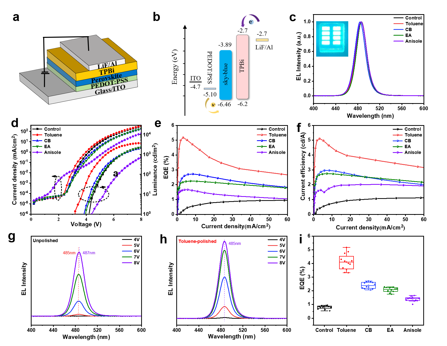 近日,开云电子(中国)官方网站_开云电子(中国)官方网站邹超课题组提出了一种溶剂抛光策略,在不影响载流子输运的前提下有效去除钙钛矿表面的富缺陷层,并有效减少非辐射复合中心n=1相的形成。通过系统研究抛光效果与溶剂极性的关联,确定甲苯溶剂能够在最大限度维持钙钛矿薄膜性质的基础上有效消除缺陷。研究中实现了高效的蓝光PeLED器件,在485 nm处的最大EQE为5.18 %,最高亮度为3737 cd m-2,启亮电压为3.2 V,分别比未抛光的PeLED器件(启亮电压:4.2 V)高出545 %和162 %。这项研究在不损失载流子输运效率的前提下为缺陷消除提供了一种新思路,以实现高效的蓝光PeLED。