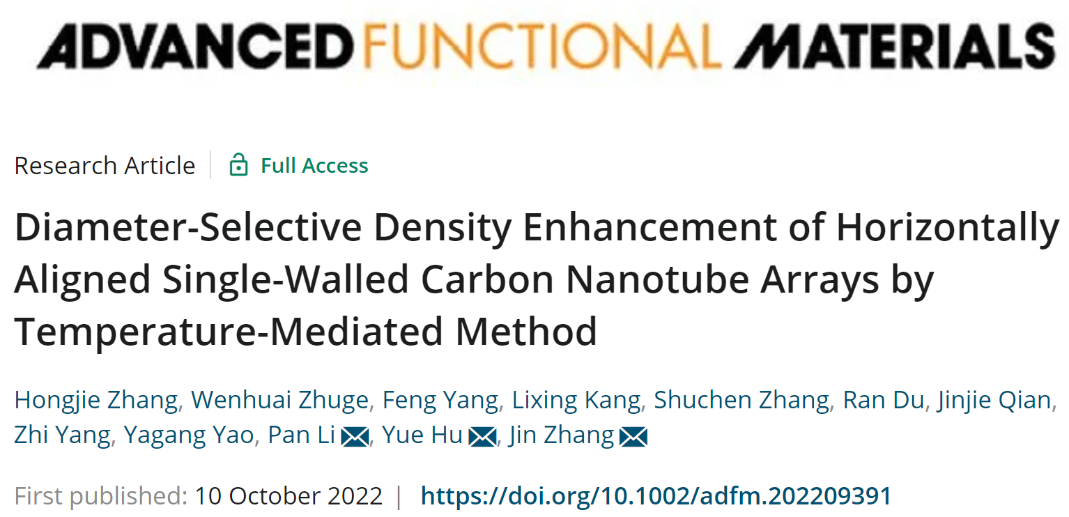 近日我校化材学院胡悦特聘教授团队联合南京邮电大学李盼副教授、北京大学张锦教授在控制制备高密度单壁碳纳米管(SWNT)方面取得新进展,开发了一种简单且新颖的温度扰动策略以制备具有管径选择性的高密度SWNT阵列,为SWNT在纳电子器件方面的提供了理想平台。相关成果以标题“Diameter-Selective Density Enhancement of Horizontally Aligned Single-Walled Carbon Nanotube Arrays by Temperature-Mediated Method”(DOI:10.1002/adfm.202209391)发表在Advanced Functional Materials。该工作通过调节温度对金属催化剂容碳量进行调控,再活化具有特定尺寸的因被碳包覆而失活的催化剂,使其继续催化生长特定管径的SWNT。最终使得在石英基底上获得的SWNT阵列的密度增加了三倍以上,且管径分布控制在2纳米左右。并通过环境透射电子显微镜对催化剂再活化过程进行原位研究,为催化剂效率的提高提供了关键性的见解。使用获得的SWNT阵列制作场效应晶体管器件,该器件表现出非常优秀的载流子迁移能力,表明所获得的SWNT阵列在纳电子器件中的应用潜力。相关文章发表在Advanced Functional Materials上,开云电子(中国)官方网站_开云电子(中国)官方网站为第一通讯单位,我校化材学院2019级研究生张红杰为第一作者,化材学院胡悦特聘教授、南京邮电大学李盼副教授及北京大学张锦教授为共同通讯作者。相关工作受到国家自然科学基金和浙江省自然科学基金项目的资助。