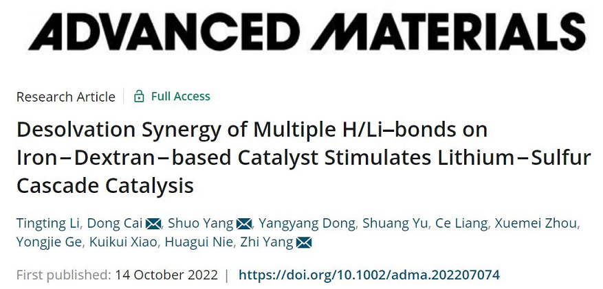 因此,本研究以“Desolvation Synergy of Multiple H/Li–bonds on Iron−Dextran−based Catalyst Stimulates Lithium−Sulfur Cascade Catalysis”为题发表在材料领域顶级期刊《Advanced Materials》。开云电子(中国)官方网站_开云电子(中国)官方网站作为第一通讯单位,2020级研究生李婷婷为第一作者,我校化学与材料工程学院杨植教授、蔡冬博士和电气与电子工程学院杨硕博士为共同通讯作者,我校聂华贵教授、葛勇杰博士、肖逵逵博士、周学梅博士、硕士生梁策、于爽同学以及首届博士生东洋洋同学参与了这项工作。该工作得到国家自然科学基金、浙江省自然科学基金的部分资助。