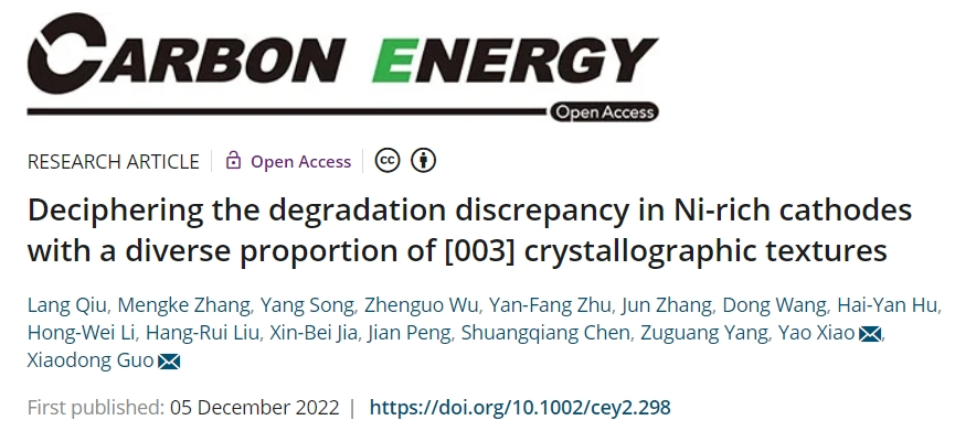 该成果以“Deciphering the degradation discrepancy in Ni-rich cathodes with the diverse proportion of [003] crystallographic texture”为题发表在高水平期刊Carbon Energy(IF: 21.556)上。我校化材学院肖遥教授与四川大学郭孝东教授为该论文共同通讯作者。