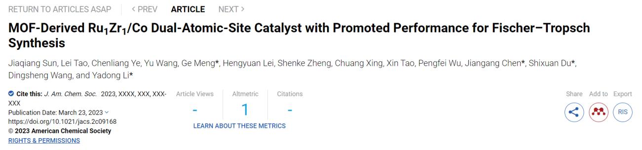 基于DASC的优点和对费托合成研究的不足,我校孟格博士课题组与山西煤化所陈建刚教授、中国科学院大学杜世萱教授以及清华大学李亚栋院士课题组合作合成了Ru1Zr1/Co DASC,该催化剂在200℃下表现出3.8×10-2s-1的高翻转频率(TOF)和80.7%的C5+选择性,这远高于Co、Zr1/Co和Ru1/Co对应的值。密度泛函理论(DFT)计算表明Ru/Zr原子在Co NPs上的界面可以协同作用促进链生长,降低C-O断裂势垒。该工作为高性能费托合成和其他工业催化过程的DASC设计提供了新的机会。这一成果近期发表在Journal of the American Chemical Society(DOI:10.1021/jacs.2c09168)。开云电子(中国)官方网站_开云电子(中国)官方网站化材学院孟格博士为通讯作者之一。