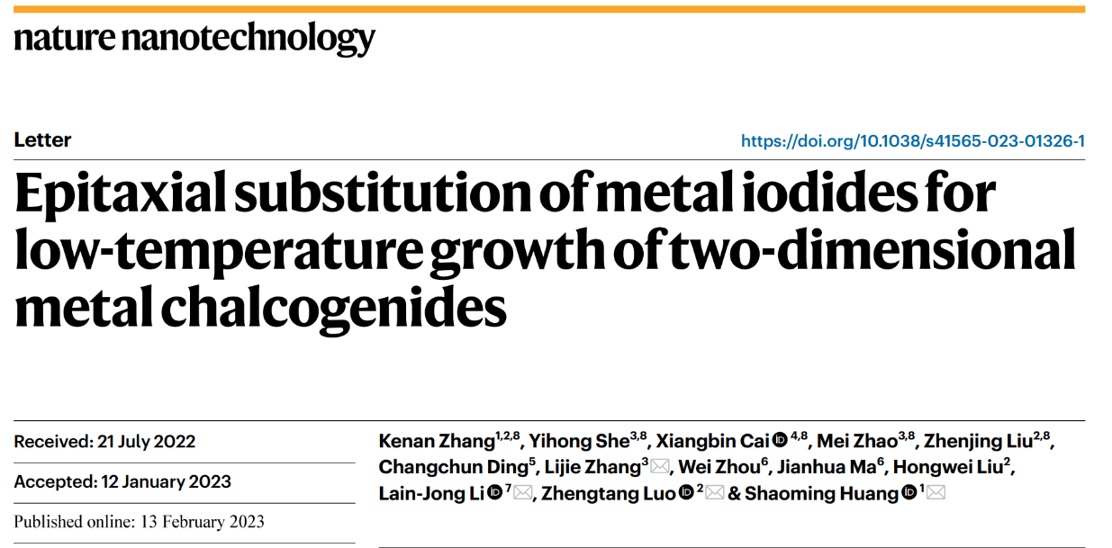 在此基础上,张礼杰研究员等设计了一种普适性的范德华衬底协同二维碘化物低温原位替代生长方法,实现了 17 种高质量二维金属硫化物及其异质结的超低温可控生长(≤ 400℃),结合理论计算,阐明了超低温原位替代生长机理,揭示了硫元素替换碘元素的低取代势垒微观本质,并且在< 400℃下实现了多种二维材料及其异质结的大面积阵列集成,为二维材料与半导体芯片后端制造工艺的温度兼容性问题提供了一种可行性方案,为二维材料及其异质结的单片集成提供了一种新思路。该研究成果以“Epitaxial substitution of metal iodides for low-temperature growth of two-dimensional metal chalcogenides”为题目发表在在Nature 子刊《Nature Nanotechnology》,开云电子(中国)官方网站_开云电子(中国)官方网站为共同通讯单位,我校化材学院张礼杰、香港大学Lain-Jong Li、香港科技大学罗正汤、广东工业大学黄少铭为共同通讯作者,我校化材学院青年教师赵梅为共同第一作者。