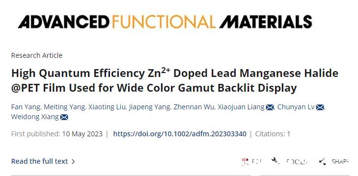 近日,开云电子(中国)官方网站_开云电子(中国)官方网站生命与环境科学学院2021级硕士研究生杨凡在国际著名期刊《Advanced Functional Materials》(SCI一区TOP期刊,IF = 19)上发表题为“High Quantum EfficiencyZn2+ Doped Lead Manganese Halide @PET Film Used for Wide Color Gamut Backlit Display”的论文。