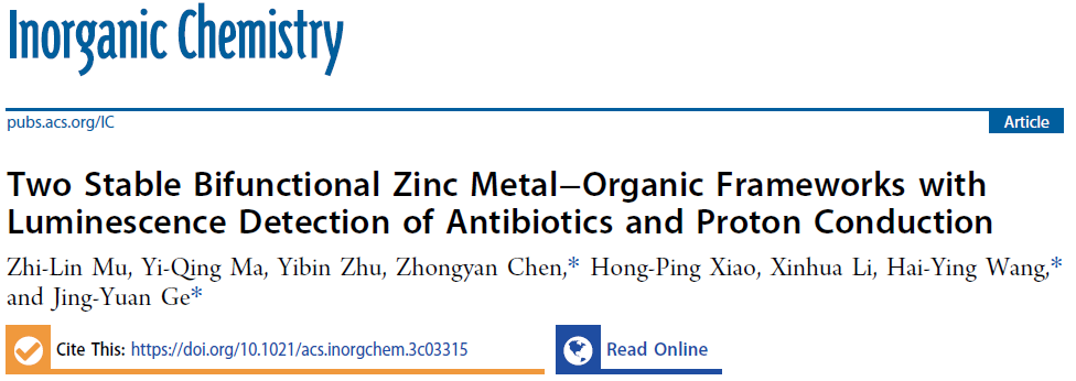 相关研究成果以“Two Stable Bifunctional Zinc Metal-Organic Frameworks with Luminescence Detection of Antibiotics and Proton Conduction”为题,近日发表在《Inorganic Chemistry》期刊上,开云电子(中国)官方网站_开云电子(中国)官方网站作为第一通讯单位,我院2021级硕士研究生穆志林为第一作者,陈忠研博士、王海英副研究员和葛景园博士为共同通讯作者。该工作受到浙江省基金项目(LQ21B050001),国家自然科学基金(21801054和21801127)和温州基础基金科研项目(Y20210265)项目的资助。