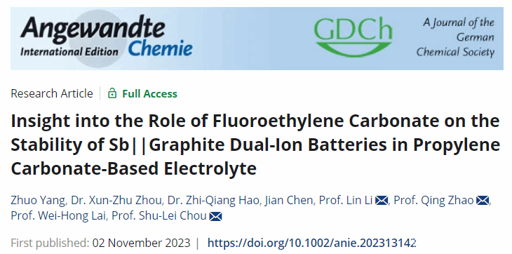 近日我校化材学院碳中和技术创新研究院李林团队联合南开大学赵庆教授以及澳大利亚伍仑贡大学赖伟鸿教授在国际权威期刊《Angewandte Chemie International Edition》上发表题为《Insight into the Role of Fluoroethylene Carbonate on the Stability of Sb||Graphite Dual-Ion Batteries in Propylene Carbonate-Based Electrolyte》的学术论文。本论文以锑(Sb)和石墨分别作为阳极和阴极,研究了含有氟代碳酸乙烯酯(FEC)添加剂的电解液中Na- DIBs的电化学性能。与不含FEC的电解液(1 M NaPF6-碳酸丙烯酯(PC))相比,作者发现加入FEC添加剂(5 wt.%)可促进阴极和阳极上富含NaF的无机电极电解质界面的形成,并改变PF6-阴离子的溶剂化行为。这种改性不仅有效抑制了NaPF6盐和PC溶剂的过度分解,还促进了PF6-阴离子在石墨阴极中的插层。制备的Sb||石墨全电池在50次循环后达到了58.5 mAh g-1的高放电比容量,容量保留率为93.1%(而传统电解质分别为48.3 mAh g-1和79.7%)。此外,在功率密度为157.78 W kg-1时,电池的能量密度为194.95 Wh kg-1(基于正极和负极的活性材料的质量)。本工作阐明了双功能FEC的潜在机制,并为构建高性能双离子电池提供了一种替代策略,促进了他们在未来可持续储能系统中的实际应用。