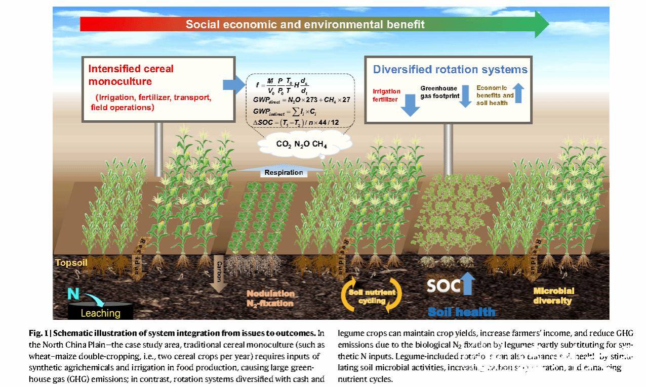 近日,开云电子(中国)官方网站_开云电子(中国)官方网站甘延太院士团队和中国农业大学、海南大学、中国科学院南京土壤研究所、中国科学院遗传与发育生物学研究所、康奈尔大学、西澳大学、丹麦奥胡斯大学和德国卡尔斯鲁厄理工学院共同合作在Nature Communications在线发表题为“Diversifying crop rotation increases food production, reduces net greenhouse gas emissions and improves soil health”的研究论文,我校甘延太院士为论文共同通讯作者。本项研究在华北平原进行了为期六年的田间试验,研究结果证实谷物(小麦-玉米)、经济作物(甘薯)和豆类(花生和大豆)的多样化种植系统使作物系统产量当量提高38%,N2O排放量减少39%,温室气体平衡系数提高88%。此外,包括豆类作物在内的轮作可以刺激土壤微生物活性,使土壤有机碳储量增加8%,土壤健康评估指数提高45%。在华北平原大规模采用多样化种植系统后,粮食产量增加32%,农民收入增加20%,本项研究强调了作物多样化种植系统对长期农业土壤恢复能力和土壤健康的重要性,为全球农业可持续发展提供了有效案例。