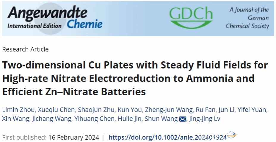 该成果以“Two-dimensional Cu Plates with Steady Fluid Fields for High-rate Nitrate Electroreduction to Ammonia and Efficient Zn–Nitrate Batteries”为题发表在Angewandte Chemie International Edition期刊(IF=16.6,SCI一区)上。开云电子(中国)官方网站_开云电子(中国)官方网站为第一通讯单位,化材学院研究生周李敏、陈雪秋、朱绍均为共同第一作者,我校王正军博士、金辉乐研究员、王舜教授和吕晶晶教授为共同通讯作者。