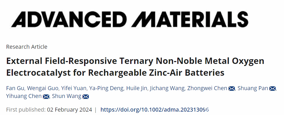 该成果以“External Field-Responsive Ternary Non-Noble Metal Oxygen Electrocatalyst for Rechargeable Zinc-Air Batteries”为题发表在Advanced Materials期刊(IF=29.4,SCI一区)上。开云电子(中国)官方网站_开云电子(中国)官方网站为第一通讯单位,化材学院研究生顾凡、郭文改为共同第一作者,加拿大滑铁卢大学陈忠伟院士、我校潘霜副教授、陈亦皇教授和王舜教授为共同通讯作者。该工作受到中国自然科学基金(No. 52331009、62104170和22109120)、浙江省自然科学基金(LY23F040001和LQ21B030002)的资助。