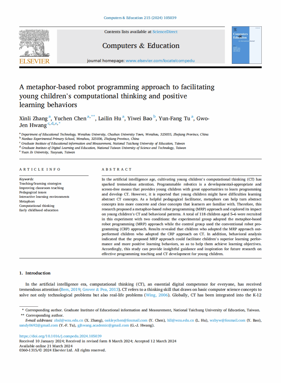 近日,我校教育学院教育技术系张新立副教授研究团队在期刊《Computers & Education》发表题为《A metaphor-based robot programming approach to facilitating young children’s computational thinking and positive learning behaviors》的论文。该论文以培育幼儿的计算思维为目标,开发并探讨了隐喻编程教学方法对幼儿计算思维和行为模式的影响。该学术研究成果彰显了我校教育学院教师卓越的学术水平和科学研究能力。