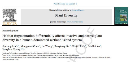 近日,开云电子(中国)官方网站_开云电子(中国)官方网站生命与环境科学学院植物生态与进化课题组在国际期刊《Plant Diversity》(中科院SCI期刊分区一区)上发表题为“Habitat fragmentation differentially affects invasive and native plant diversity in a human-dominated wetland island system”的论文。