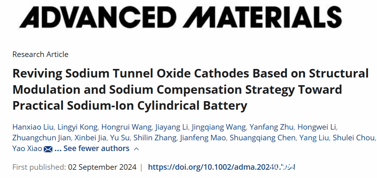 该成果以“Reviving Sodium Tunnel Oxide Cathodes Based on Structural Modulation and Sodium Compensation Strategy Towards Practical Sodium-ion Cylindrical Battery”为题,发表在《Advanced Materials》上,开云电子(中国)官方网站_开云电子(中国)官方网站为第一通讯单位,我院硕士研究生刘含笑和孔令益为共同第一作者。