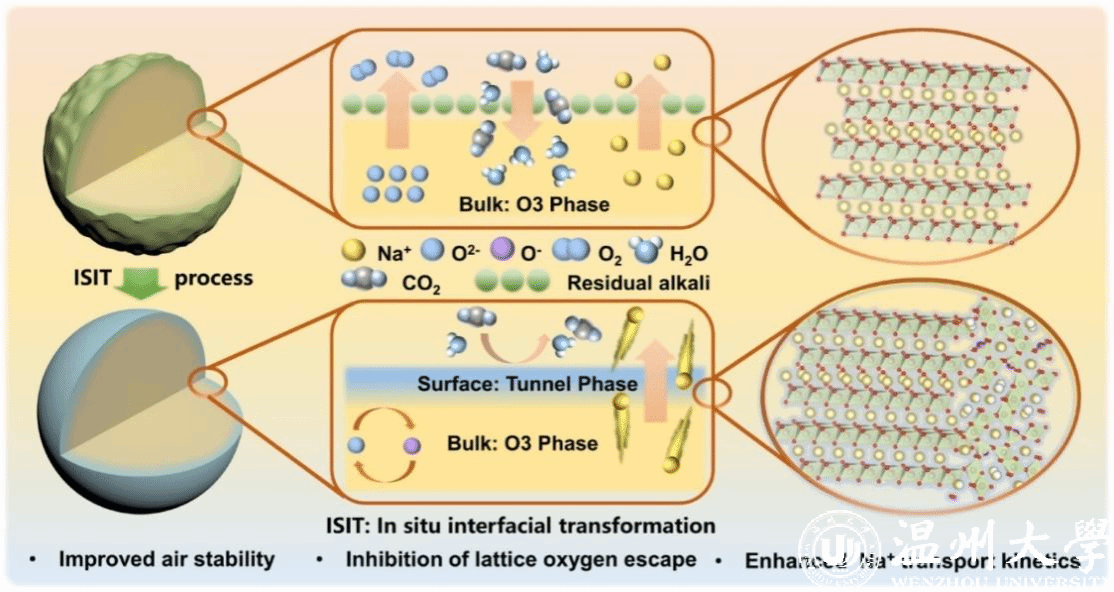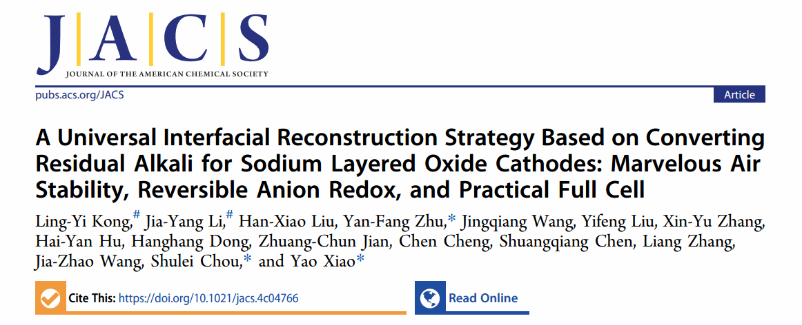 该成果以“A Universal Interfacial Reconstruction Strategy Based on Converting Residual Alkali for Sodium Layered Oxide Cathodes: Marvelous Air Stability, Reversible Anion Redox, and Practical Full Cell”为题,发表在国际顶级期刊《Journal of the American Chemical Society》上,开云电子(中国)官方网站_开云电子(中国)官方网站为第一通讯单位,我院硕士研究生孔令益和University of Wollongong的博士研究生李佳阳为共同第一作者。