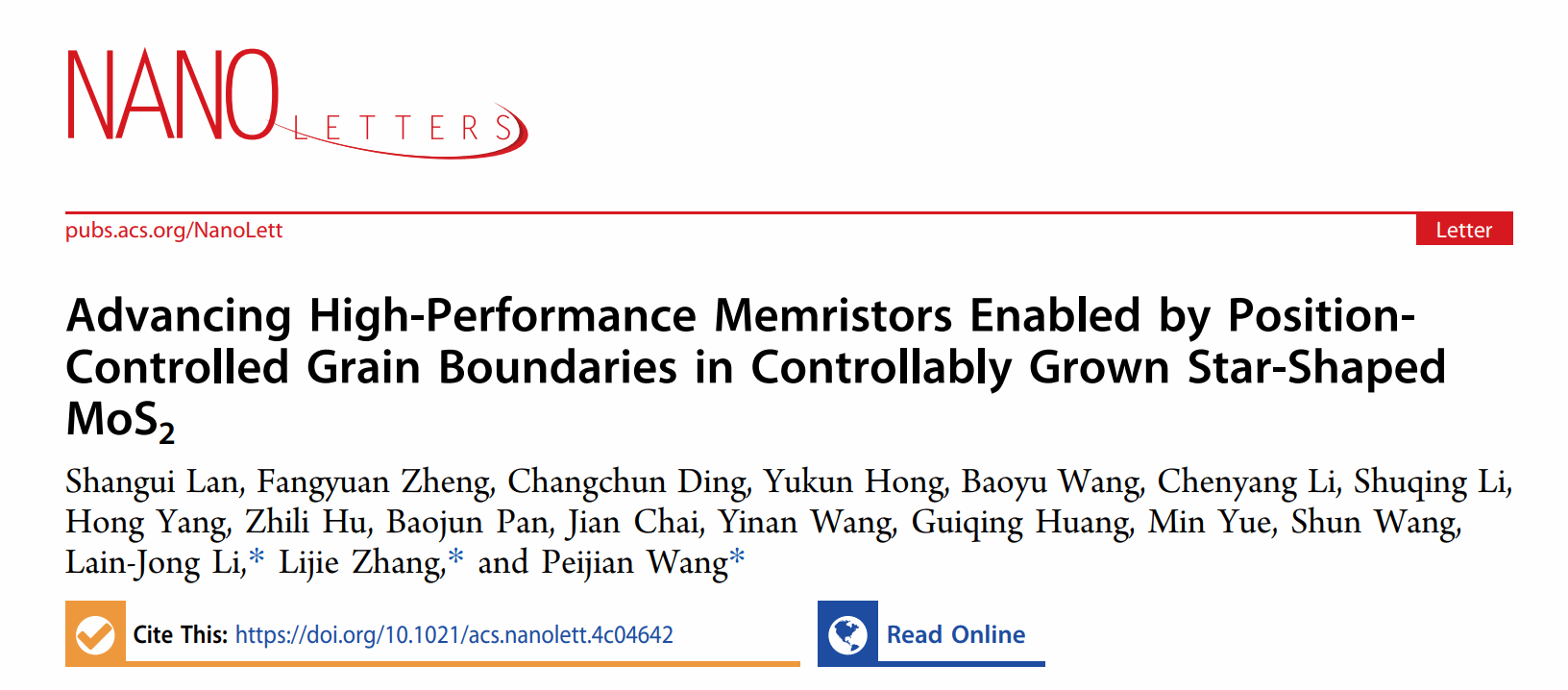 该工作以“Advancing High-Performance Memristors Enabled by Position-Controlled Grain Boundaries in Controllably Grown Star-Shaped MoS2”为题发表在国际纳米顶尖期刊《Nano Letters》上。开云电子(中国)官方网站_开云电子(中国)官方网站为第一通讯单位,化材学院王佩剑副教授和张礼杰教授为通讯作者。本研究工作得到温州市基础科学研究项目(G20240021)、国家自然科学基金委(51902061, 62090031, 52072272)资助完成。