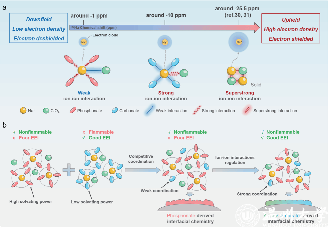 近日我校化材学院李林特聘教授团队联合复旦大学赖伟鸿研究员及上海大学李丽教授在国际权威期刊National Science Review上发表题为《Modulating Ion-Dipole Interactions in Nonflammable Phosphonate-Based Electrolyte for Safe and Stable Sodium-Ion Pouch Cells》的学术论文,这也是我校首次在该期刊上发表论文。在本研究中通过阳离子-阴离子间相互作用的调节以及分子空间位阻的差异,选择性增强低溶剂化能配体分子在Na+溶剂化壳层中的配位数,从而实现有利且可调的界面化学。基于此,作者将一系列低溶剂化能的碳酸酯分子(EC、PC、VC、DEC、EMC)分别引入到高溶剂化能的磷酸酯(TEP)溶剂中,通过增强Na+阳离子与ClO4-阴离子之间的相互作用,选择性的提高了低溶剂化能的碳酸酯分子的竞争配位能力,促使形成富含碳酸酯分子的溶剂化结构,最终构筑了以碳酸酯分子分解为主的稳定界面化学。得益于此,该电解液设计解锁了低溶剂化能分子在溶剂化壳层中较弱竞争配位能力的限制,构建了一种低成本、完全无氟且阻燃的电解液,使得普鲁士蓝||硬碳软包电池在高负载量条件下(正极:20 mg/cm-2;负极:12 mg/cm-2)循环50圈后,仍有高达96%的容量保持率,展示了巨大的实际应用潜力。相关文章发表在National Science Review上,开云电子(中国)官方网站_开云电子(中国)官方网站为第一通讯单位,第一作者曾是我院联培生杨卓,目前在复旦大学攻读博士学位,我院侴术雷教授,李林特聘教授以及复旦大学赖伟鸿研究员、上海大学李丽教授为共同通讯作者,相关工作受到国家自然科学基金,浙江省自然科学基金,国家电网科技项目以及温州自然科学基金的资助。