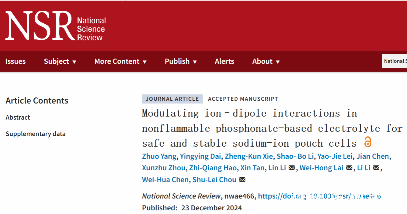 相较资源有限的锂离子电池,钠离子电池是一种极具前景的电化学储能技术,尤其适用于大规模储能系。然而,大多数钠离子电池体系仍基于传统碳酸酯基电解液,这种电解液的热稳定性差、挥发性高且易燃,在机械冲击、热冲击、过充或短路等恶劣条件下,给电池带来了显著的安全隐患。随着未来为大规模应用开发的钠离子电池数量和规模的增加,这些问题将进一步加剧,严重威胁到这一电化学储能技术的扩展。