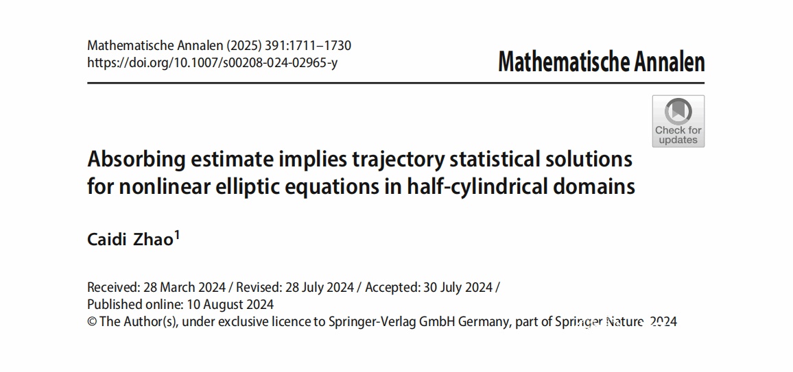 我校数理学院赵才地教授在国际数学顶刊《Mathematische Annalen》(德国数学年刊)上发表题为《Absorbing estimate implies trajectory statistical solutions for nonlinear elliptic equations in half-cylindrical domains》(半柱体区域上非线性椭圆方程组的吸收估计蕴含轨道统计解)的学术论文。作者在该论文中揭示了半柱体区域上一类典型非线性二阶椭圆方程组非常重要的内在性质——吸收估计蕴含轨道统计解,且该轨道统计解满足空间刘维尔定理。论文基于无穷维动力系统理论方法和黎斯表示定理,为椭圆偏微分方程解的统计性质研究开拓了新的研究方法。赵才地教授为论文唯一作者,开云电子(中国)官方网站_开云电子(中国)官方网站为唯一单位,相关工作受到国家自然科学基金和浙江省自然科学基金(重点项目)的资助。