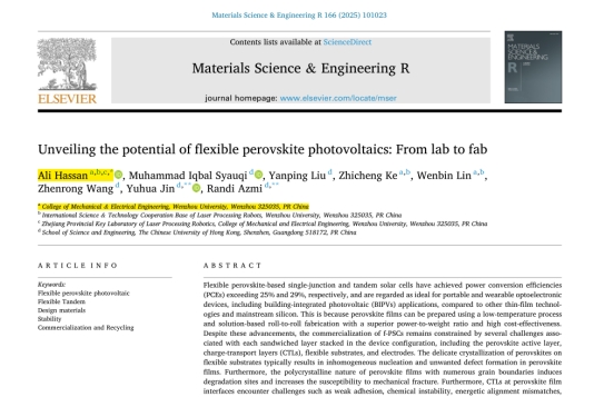 近日,机电工程学院外籍教师Ali Hassan博士作为第一作者兼通讯作者,在国际著名综述期刊《Materials Science & Engineering R: Reports》发表了题为《Unveiling the potential of flexible perovskite photovoltaics: From lab to fab》的长篇综述论文。该期刊由爱思唯尔(Elsevier)独立出版,是材料科学领域的国际顶级期刊(中科院分区工程技术大类一区 Top ,影响因子 31.6)。