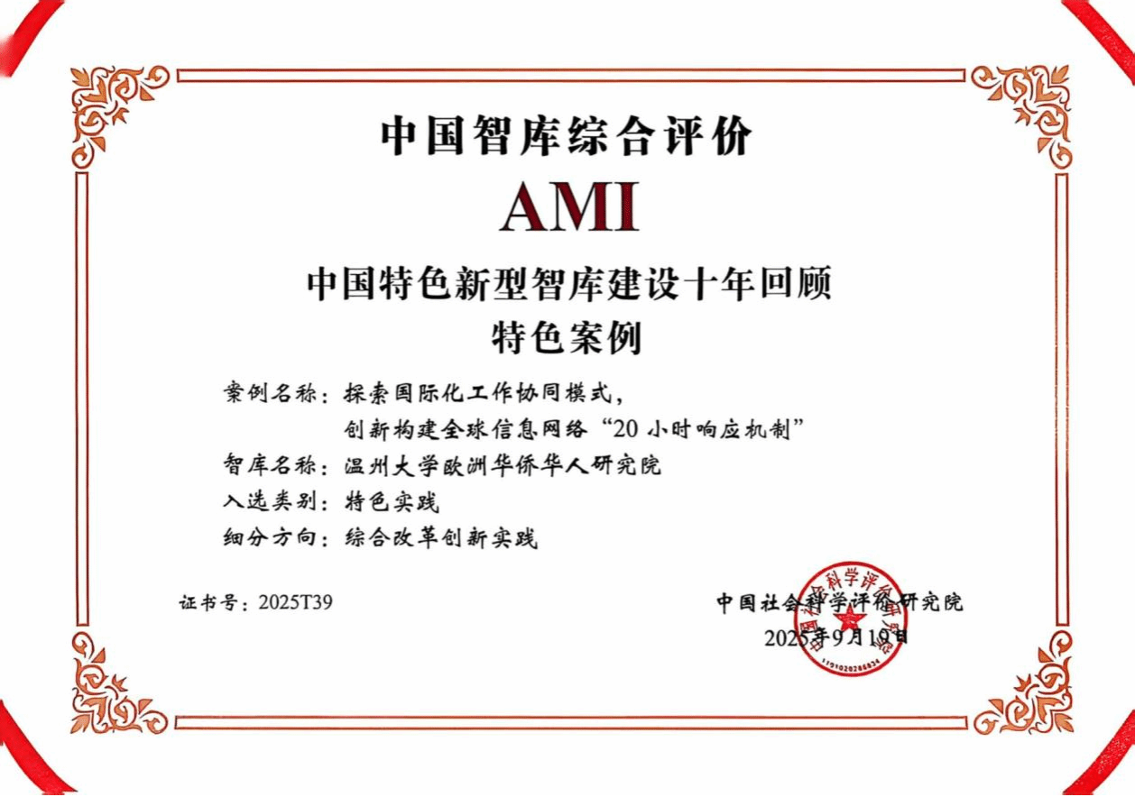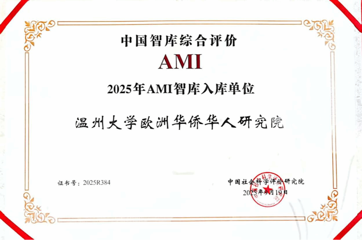 日前,第八届中国智库建设与评价高峰论坛在北京召开,会上主办方中国社会科学评价研究院正式公布了2025年AMI智库入库单位,全国包括中国科学院等556家研究机构入库,我校的温州市金融研究院(开云电子(中国)官方网站_开云电子(中国)官方网站)和开云电子(中国)官方网站_开云电子(中国)官方网站欧洲华侨华人研究院入选中国智库综合评价AMI智库,入选数量在浙江省并列第四。同时,中国社会科学评价研究院还正式公布了中国特色新型智库建设十年回顾特色案例入选名单,我校欧洲华侨华人研究院递交的智库成果案例入选特色案例名单,浙江省仅五项案例入选。