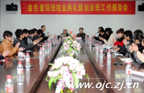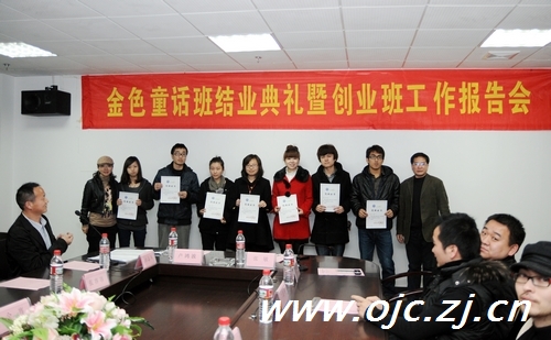 会上,创业指导师闵志军介绍了金色童话班从2009年10月份开课以来的授课情况,本期金色童话班共有32名学员通过专业考试,取得学院和金色童话公司共同颁发的结业证书,学院党委副书记张敏与金色童话公司董事长卢鸿波一起为结业学员颁发了证书。同时,闵志军就"乐咔咔社团影像"运行情况从前期组建、2010年发展思路及业绩目标等几个方面作了汇报,创业班学员组织对2010年业绩指标现场举行激烈的挑战、应战仪式。张敏称赞本次报告会别开生面,也给"乐咔咔社团影像"的成员提出了殷切的希望和要求。卢鸿波表示金色童话公司将为本期合格学员敞开就业大门,并希望尽快启动第二期"金色童话班"开班工作。