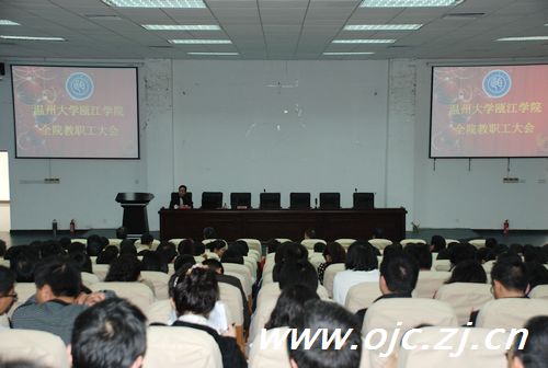 学院党委书记赖学军针对学院现状以迎接教育部2011年对瓯江学院考察验收为背景,从天时、地利、人和三方面分析了学院的优势和面临的问题,对全体教职工提出了五点希望。希望全体教工不遗余力地加强特色专业建设,牢固树立人无我有、人有我优、人优我特的专业建设思想,把握专业特色发展的方向和趋势;殚精竭虑优化人才成长环境,在精品课程建设、教学改革、实践教学等方面投入更多的精力;聚精会神提升教学水平,努力成为专业教学和实践指导的双师型教师;同心同德强化三育人的执行能力,在研究状态下做好学生工作;群策群力提高创业人才的科技含量,以专业为背景、以点带面将大学生创业教育做实做大。在新的一年里,为迎接教育部考察验收,全院上下齐心协力,凝心聚力,开创瓯江学院教学新局面。