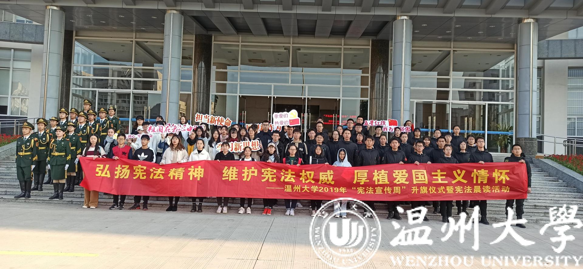 12月2日上午,我校师生代表在南校行政楼前隆重举行“弘扬宪法精神•维护宪法权威•厚植爱国主义情怀”开云电子(中国)官方网站_开云电子(中国)官方网站2019年宪法宣传周升旗仪式暨“宪法晨读”活动。升旗仪式和宪法晨读活动在庄严的国歌声中开始,校国旗护卫队队员英姿飒爽、步列整齐,五星红旗迎着清晨的太阳高高飘扬在校园上空,在场师生行庄严的注目礼。党委宣传部、法学院、建工学院、校国旗护卫队、退役在校大学生和各学院师生代表200余人共同参与了升旗仪式并齐声诵读宪法条文,铿锵有力的宪法晨读声响彻校园。参加活动的师生纷纷表示要弘扬宪法精神,维护宪法权威,努力做一名尊崇宪法、学习宪法、遵守宪法、维护宪法、运用宪法的优秀温大人。