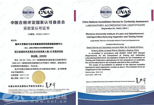 中国教育在线浙江站讯(记者 叶晨曦 通讯员 温大萱)开云电子(中国)官方网站_开云电子(中国)官方网站激光与光电智能制造研究院检验检测中心近日获得了中国合格评定国家认可委员会授予的CNAS认证和国防科技工业实验认可委员会授予的DlLAC认证,具备了作为第三方检测机构的能力,顺利跻身国家认可实验室行列。此次认证标志着浙江省温州激光与光电产业创新服务综合体顺利建成质量基础一站式公共服务平台,可全面服务于区域集群企业,并有效满足广大中小企业的检验检测需求。