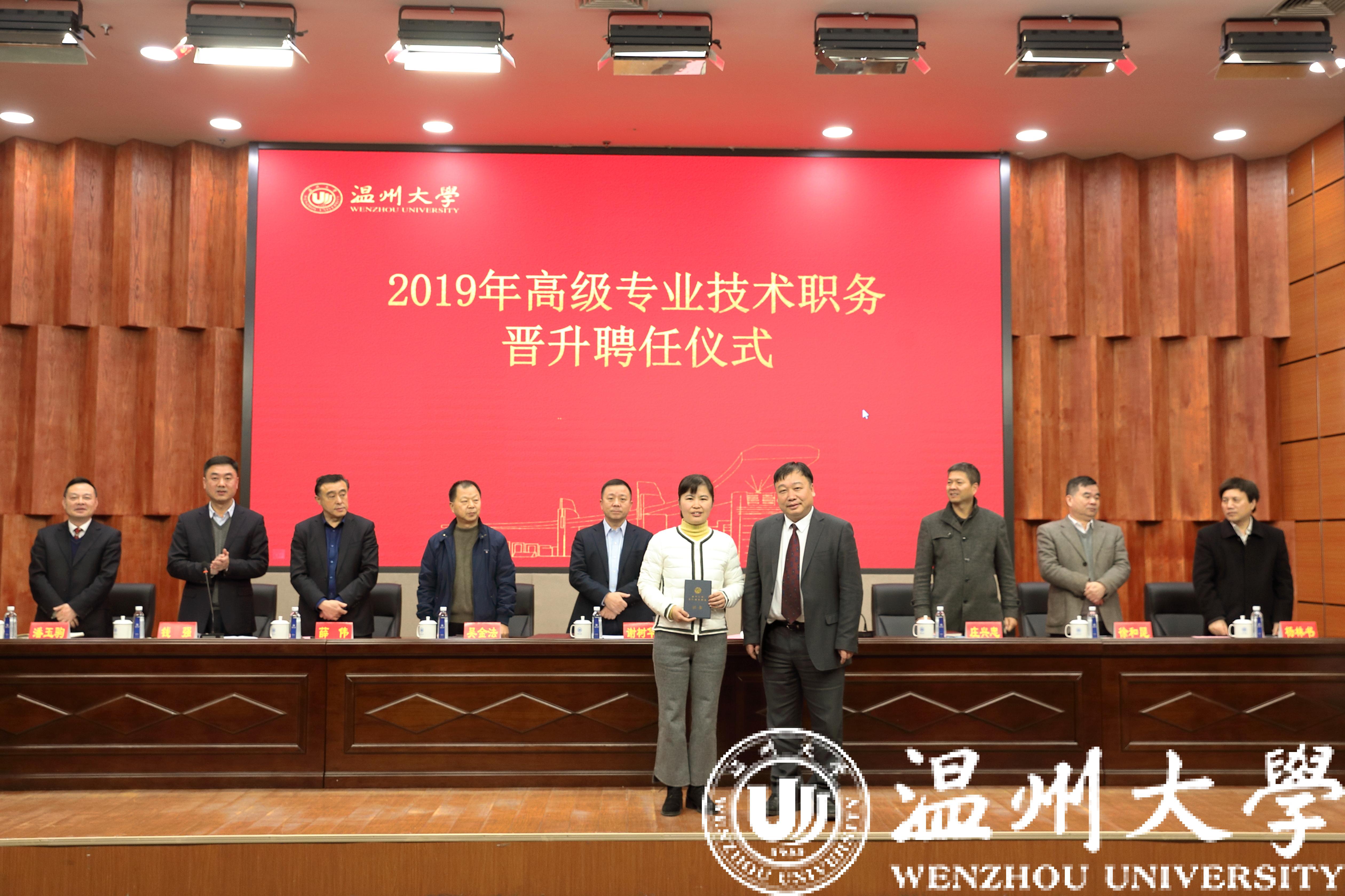 12月31日下午,我校在南校区岩松堂雁山厅隆重举行2019年高级专业技术职务晋升聘任仪式。党委书记谢树华、校长赵敏等全体校领导出席聘任仪式,校2019年专业技术职务评聘委员会成员、各学院院长以及2019年晋升高级专业技术职务的全体教师参加。会议由钱强副校长主持。