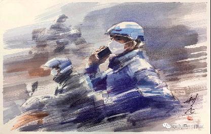 以穿梭在城中的快递小哥为原型,李利民创作水彩作品《小哥》,致敬在战“疫”中默默付出的社会人群。“他们是为维系社会需求和正常秩序奋战在一线的重要战士,是城市温暖的传递者!”
