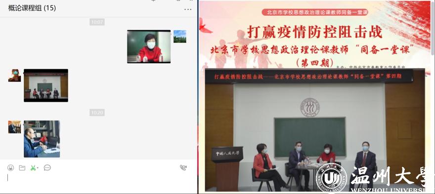 面对疫情,学院成立线上教学服务队,定期推送全国思政课第一课教学案例,全员收看北京市学校思政课教师“同备一堂课”活动网络直播。各教研室举行网络集体备课会研讨温大新学期“思政第一课”之“抗疫思政专题课”教学方案,形成了“抗疫思政小课堂、抗疫思政大讨论、抗疫笔谈千字文”等系列教学活动。