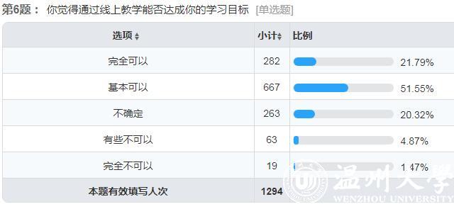 (六)73.34%的同学认为通过线上教学可以达成自己的学习目标。