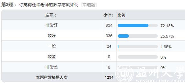 (三)绝大多数学生认为任课老师的教学态度较好,其中有72.18%同学认为任课教师的教学态度非常好。