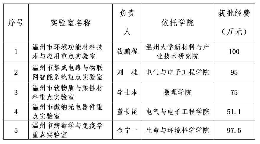 近日,温州市科技局公布了2020年度市级重点实验室(工程技术研究中心)评审结果,我校申报的温州市环境功能材料技术与应用重点实验室、温州市集成电路与物联网智能系统重点实验室、温州市软物质与柔性材料重点实验室、温州市微纳光电器件重点实验室 、温州市病毒学与免疫学实验室获得立项,目前我校共有16家温州市重点实验室(工程技术研究中心)。