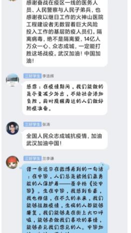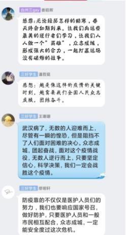 17计本2班 黄绎颖:在这特殊时期,和同学一起收听了防疫思政课,从疫情发生之日起,数据的每一次变动,都牵动着全中国人民的心。白衣天使们的每一次奔赴,都是把生死置之度外的一次生命抉择,没有人不珍惜生命,但是有凌驾于生命之上的东西-----使命。在家的我尽管无法像白衣天使那样奔赴前线,但是也积极响应我们计算机与人工智能学院的号召,和支部的党员们一起帮居民代买口罩,有空的时候去小区门口做志愿者活动。像列车经过黑暗的隧道一样,我们遇到的那些艰难的时刻,也终会突破重围迎来生机。乌云遮不住升起的太阳,疫情挡不住春天的来临,我相信在党和国家的正确领导下,在人民的高度自制下,疫情终将消散。