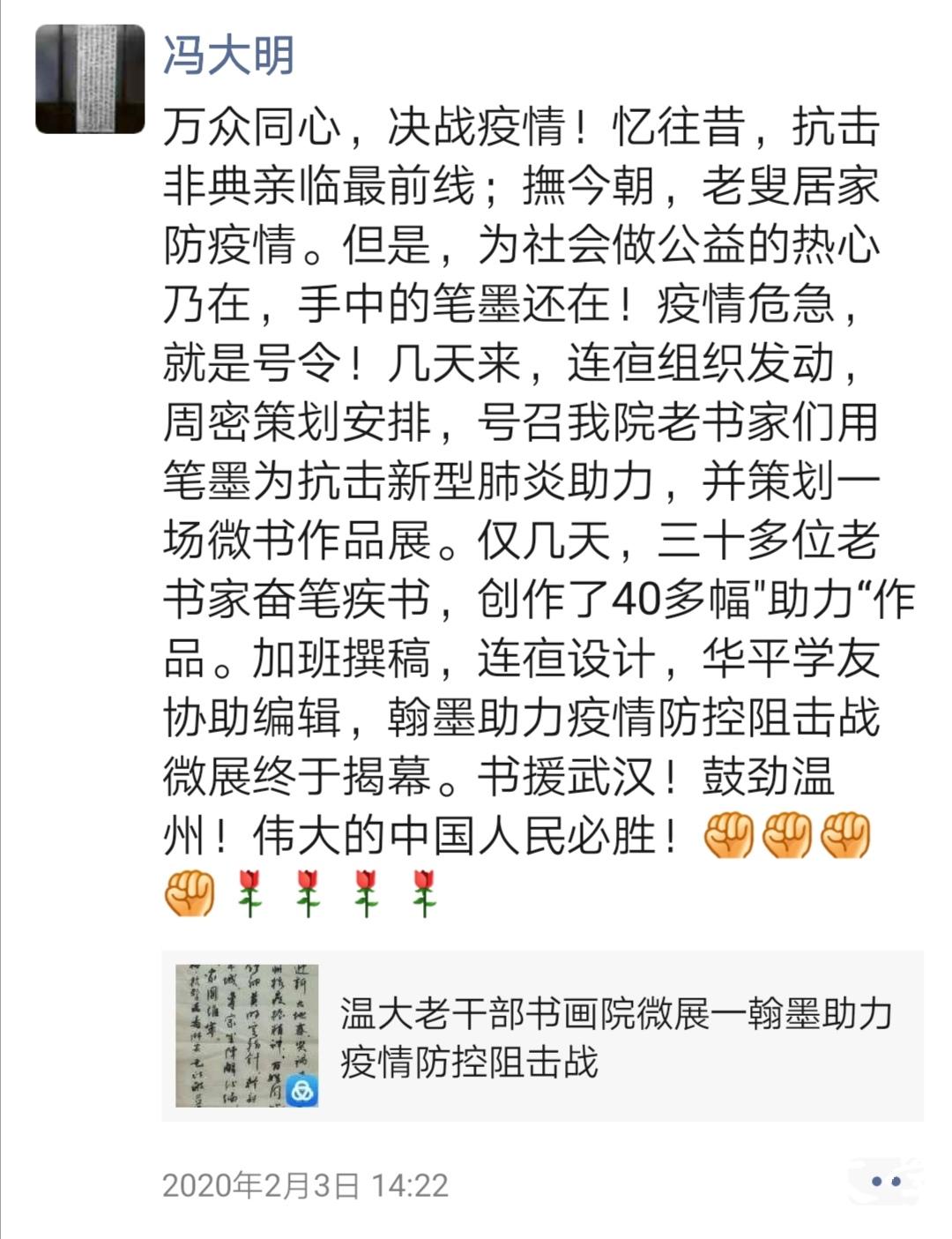 在这个不平凡的开年,一贯坚持“文化公益,服务民众”的我校老干部书画院的老书画家们,认真学习习近平总书记有关疫情防控工作的重要讲话,精心策划、积极行动。学校金礼义老书记带头撰文,助力抗击疫情决战决胜。书画院冯大明院长带领大家居家创作,宣传指示精神、讴歌战“疫”英雄、致敬最美逆行者、赞颂人间大爱。他们不顾年老体弱,不分昼夜翰墨丹青,在短短的几天时间里,创作出一百多幅书画作品,其中不少作品还被温州市委老干部局和温州市书法协会的公众号刊发。他们优选七十多幅书画作品,先后两次制作微展,转发宣传,点击量达6000余次。他们的作品鼓舞信心、振奋精神,他们众志成城、为坚决打赢疫情防控阻击战奉献丹心。