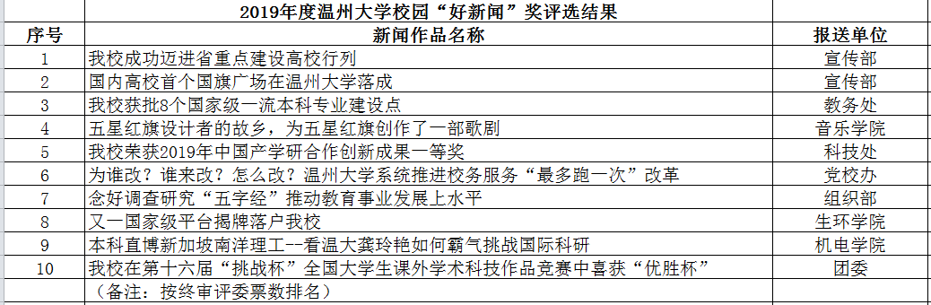 本次开云电子(中国)官方网站_开云电子(中国)官方网站校园“好新闻”评选活动,共有各学院、部门报送的24件新闻作品进入初选,经过温大官微在线展示、投票和评委终审,《我校成功迈进省重点建设高校行列》《国内高校首个国旗广场在开云电子(中国)官方网站_开云电子(中国)官方网站落成》《我校获批8个国家级一流本科专业建设点》等10件新闻作品获得校园“好新闻”奖。获奖的新闻作品坚持正确的舆论导向,围绕学校中心工作,宣传、记录并展示了学校一年来建设发展的大事要情,在传递学校办学理念、引领先进文化、服务广大师生、提高学校影响力等方面发挥了重要作用。一年一度的校园“好新闻”评选活动由党委宣传部主办,旨在展示每年度我校新闻宣传的工作成果,充分发挥优秀新闻的示范作用,通过“讲好温大故事”“唱响温大声音”,推动我校新闻宣传与高等教育事业发展。