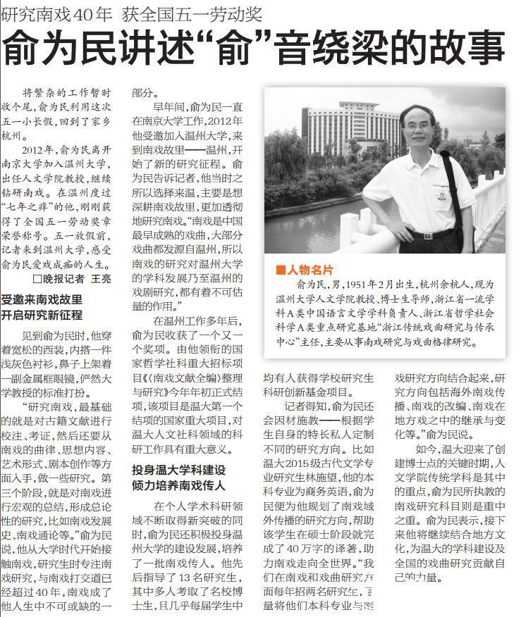 其中,以南戏研究为龙头的传统戏曲研究,有力地支持了浙南区域传统和现代文化建设。说起南戏,就不得不提温大人文学院教授、博士生导师俞为民。2012年,俞为民离开南京大学,来到南戏故里温州,开始了新的研究征程。此前接受本报记者采访时,他曾表示:“南戏是中国最早成熟的戏曲,大部分戏曲都发源自温州,所以南戏的研究对温大的学科发展乃至温州的戏剧研究,都有着不可估量的作用。”在个人学术科研领域不断取得新突破的同时,俞为民还积极投身温大的学科建设,培养了一批南戏研究传人。他来温大后指导了17名研究生,其中多人考取名校博士生,且几乎每届学生中均有人获得学校研究生科研创新基金项目。