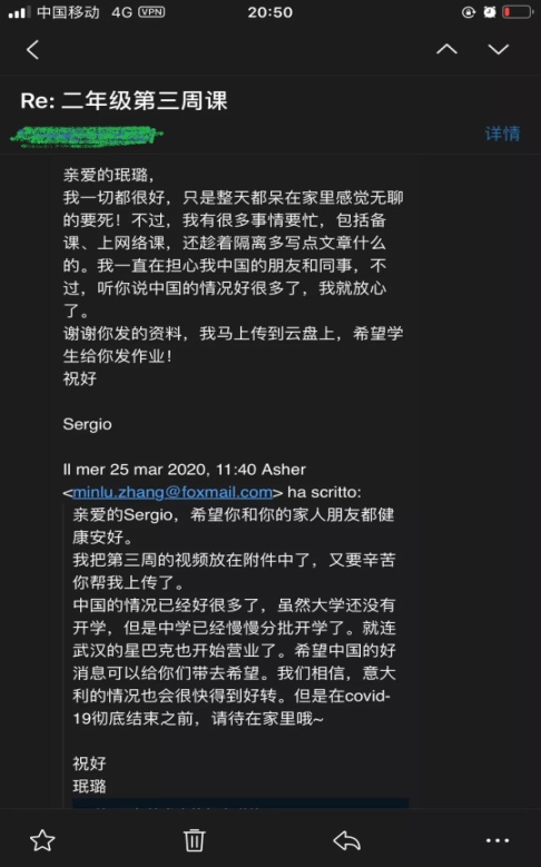 “刚回温州的时候,正是温州疫情最严重的时候。虽然远隔千山万水,意大利学生和同事时时刻刻通过网络关注中国疫情和温州疫情,几乎天天给我发来短信,询问和关心我的生活起居,这些跨越山水、跨越国界的关爱给了居家隔离的我诸多安慰。”