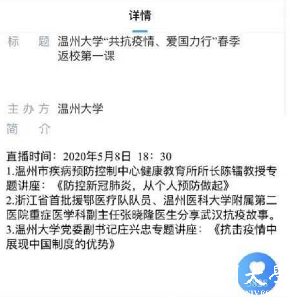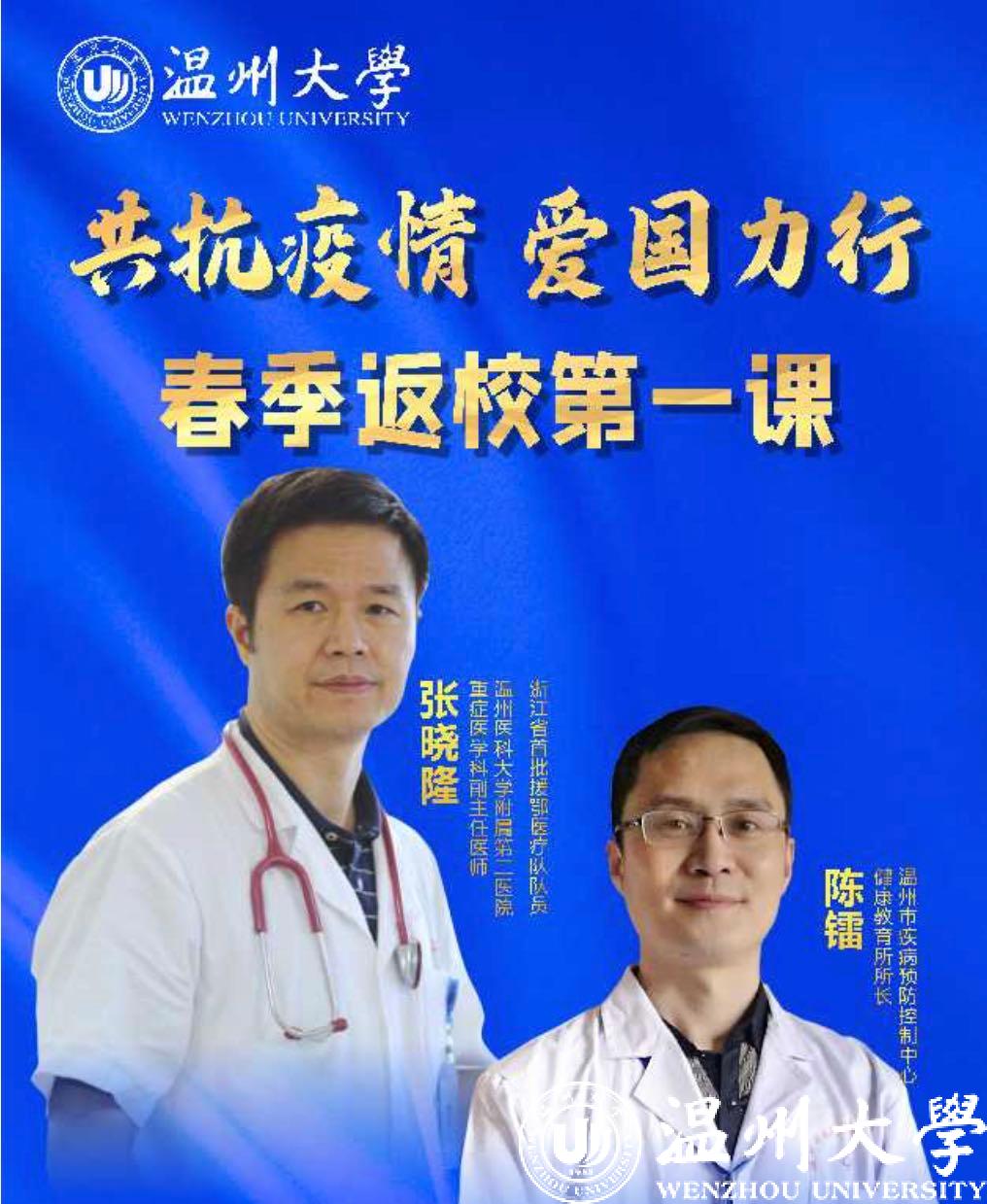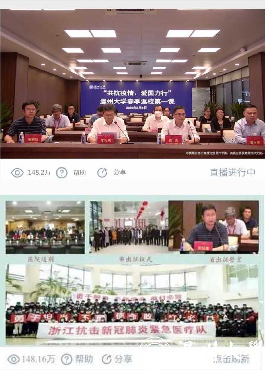 5月8日晚,正当我校学生按照“错峰分批”原则陆续返校报到之际,开云电子(中国)官方网站_开云电子(中国)官方网站“共抗疫情、爱国力行”春季返校第一课云端大开讲。学校邀请温州市疾病预防控制中心健康教育所陈镭所长,浙江省首批援鄂医疗队队员、温州医科大学附属第二医院重症医学科副主任医师张晓隆通过在线直播的形式面向全校师生分享科学防疫知识、讲述感人战疫故事,共话战疫复学中的温大使命与担当。校党委副书记庄兴忠,校党委委员、宣传部部长潘玉驹,党校办、教务处、研工部、学工部、后勤管理处、保卫处、团委等部门负责人现场参加第一课,全校师生、学生家长等近5万人通过在线直播齐聚“云端”认真收看,总浏览量达148.2万人次。