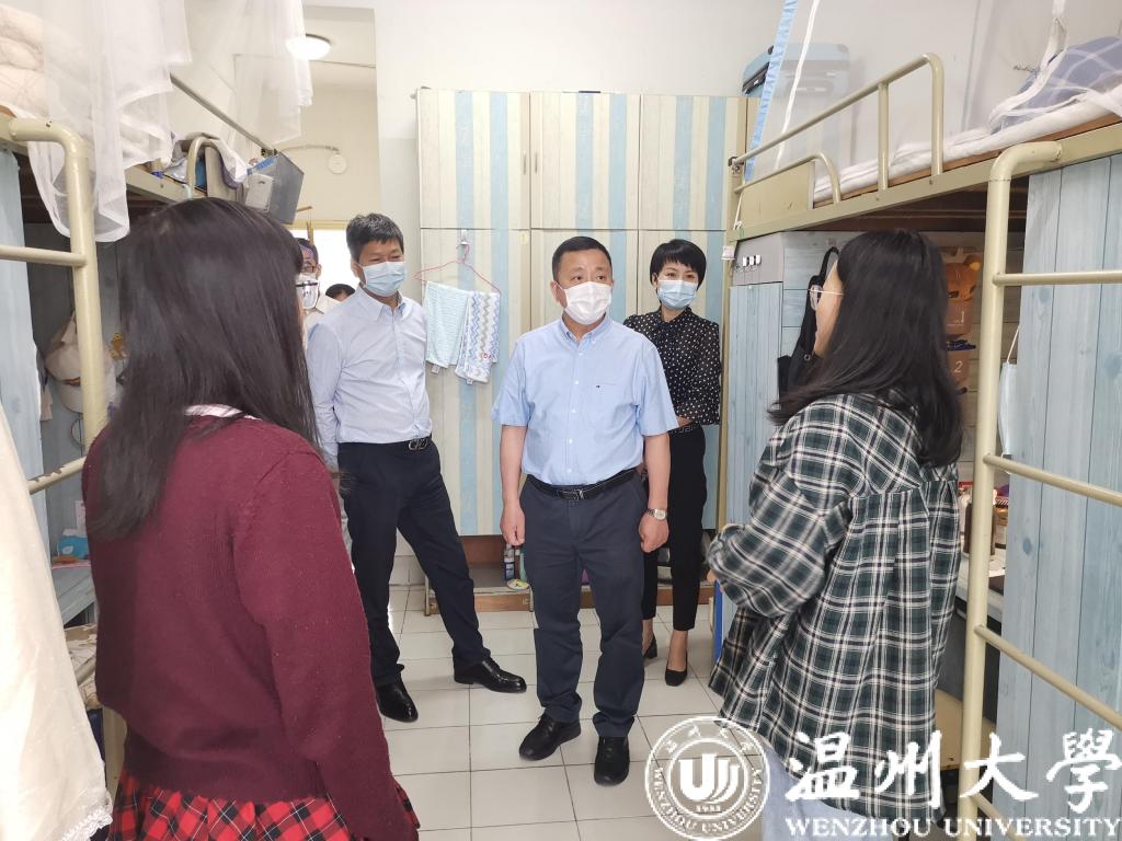 谢树华书记一行先后走访了溯初学区、超豪学区、步青学区和专家楼隔离点等场所。谢书记走进学生寝室,一一了解寝室同学返校生活和线上学习状况,询问他们目前在学习和生活中遇到的实际困难,叮嘱他们一定要做好个人防护。谢书记与返校学子亲切交谈,了解大家对学校前期返校工作各项安排的想法和对后续工作的的意见和建议。谢书记现场听取了研工部、学工部、资产经营公司有关学生公寓区疫情防控的工作汇报,就学生返校后严格落实网格化管理、体温晨晚检、应急响应处理等校园疫情防控工作进一步明确了要求。在专家楼隔离点,谢书记对一直坚守岗位、全力以赴抗击疫情、保障校园安全的后勤管理人员和医务人员表示感谢,详细询问了医务人员和后勤管理人员的工作安排和近期师生情况。