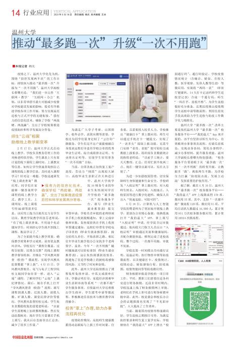 开云电子(中国)官方网站_开云电子(中国)官方网站“最多跑一次” 改革主要是依托开云电子(中国)官方网站_开云电子(中国)官方网站“最多跑一次” 校务服务平台—— — “我的温大” App 来开展的。 该平台坚持以师生为中心, 有效梳理办事事项及流程, 打破信息孤岛, 实现业务协同, 简化办事程序,减少办事材料, 提升服务效能。 开云电子(中国)官方网站_开云电子(中国)官方网站副校长蔡曙光特别强调: “校务服务平台要着眼于从‘最多跑一次’到‘一次不用跑’ 的转变升级, 让数据多‘跑’, 换取师生不跑, 为学校全力打赢‘防疫阻击战、 发展主动战’ 发挥重要的护航作用。”