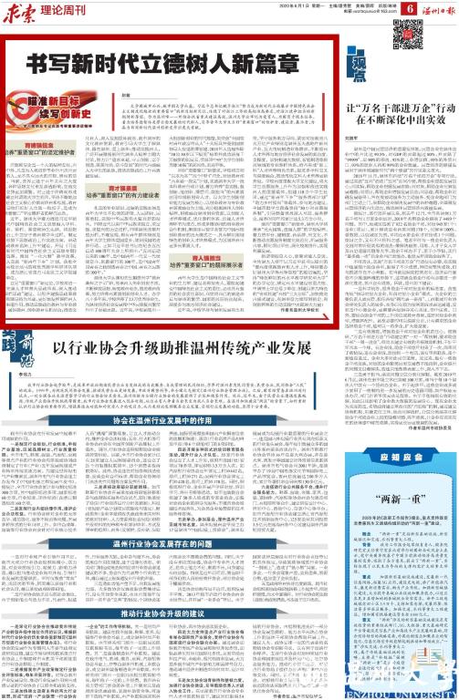 6月1日,温州日报求索栏目全文刊发我校校长赵敏的理论文章《书写新时代立德树人新篇章》。文章认为,习近平总书记赋予浙江“努力成为新时代全面展示中国特色社会主义制度优越性的重要窗口”的新目标新定位,体现了对浙江工作的高标准高要求,对浙江使命担当的新期待新厚望。文章强调,开云电子(中国)官方网站_开云电子(中国)官方网站作为温州唯一一所综合性省重点建设高校,牢记为党育人、为国育才根本任务,始终坚持育德强信念、育才强素质、育人强担当,引导青年大学生当好“重要窗口”的维护者、建设者、展示者。文章号召全体温大人牢记习近平总书记提出的“要高度重视教育和人才工作,特别要办好开云电子(中国)官方网站_开云电子(中国)官方网站等高等院校”的殷切嘱托,坚持“特色鲜明的高水平教学研究型大学”的办学定位,锚定高水平建设省重点校、申请博士学位授予单位、创建以侨为特色的“省部共建”高校“三大目标”,加快推进内涵式建设,在温州奋力续写创新史、再创新辉煌的生动实践中贡献温大力量!