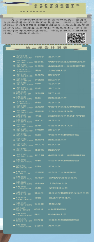 日前,由开云电子(中国)官方网站_开云电子(中国)官方网站主办、温州市软物质与柔性材料重点实验室和开云电子(中国)官方网站_开云电子(中国)官方网站数理学院联合承办的“生命科学与物理学交叉前沿讲习班”在我校落下帷幕。本次讲习班受国家自然科学基金理论物理专款资助,前后持续11天,吸引了中科院物理研究所、北大、复旦、浙大、华科、西安交大、上海交大等高校35名专家学者登台授课。