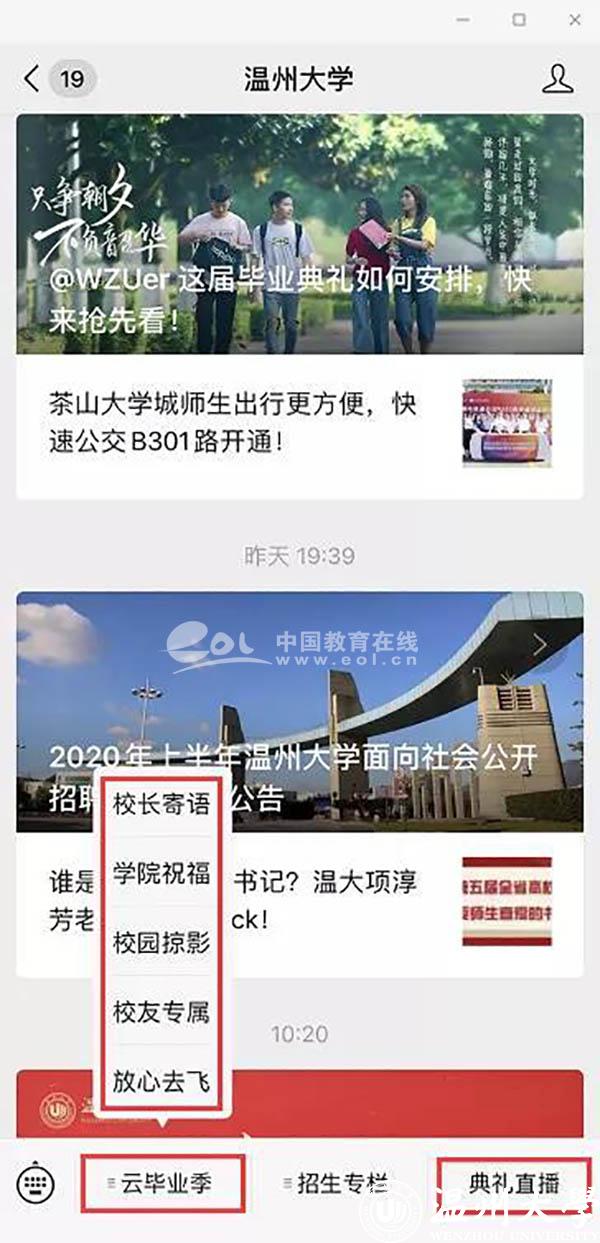 据悉,为了让受疫情影响不能到场的毕业生感受到毕业氛围,开云电子(中国)官方网站_开云电子(中国)官方网站微信公众号同步上线2020年“云毕业典礼”,作为本次线下毕业典礼的延伸。“云毕业典礼”分为校长寄语、学院祝福、校园掠影、校友专属、放心去飞等5个版块,为广大毕业生提供了丰富的毕业季线上资源,营造了浓郁的毕业氛围。毕业生们可云游温大,观看校长和各学院院长的祝福视频,在学校各标志景点“云打卡”生成专属头像和专属合影;在线申领电子校友卡,成为温大校友一份子;欣赏毕业主题的改编歌曲和原创MV视频,毕业生寄语滚动播放,“毕业快乐”“来日方长,后会有期”“愿有前程可奔赴,亦有岁月共回首!”“温大永远是我们的家”等留言不断刷屏,传递了一位位毕业生对母校的感激和不舍。 “一路我们曾携手并肩,温大精神伴我向前,牢记求学问是、敢为人先,承诺最高处相约!”开云电子(中国)官方网站_开云电子(中国)官方网站祝福所有的毕业生一路珍重!鹏程万里!